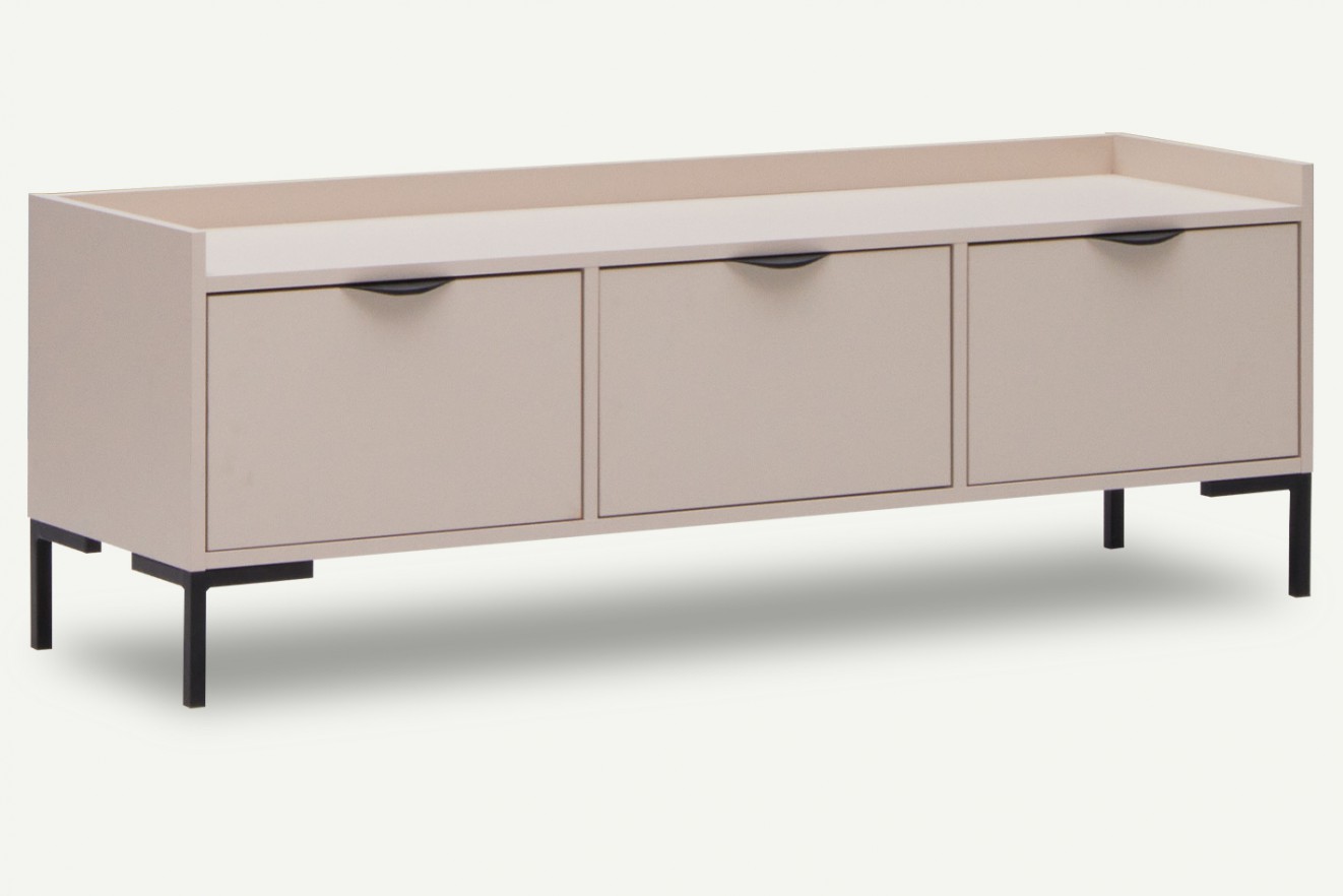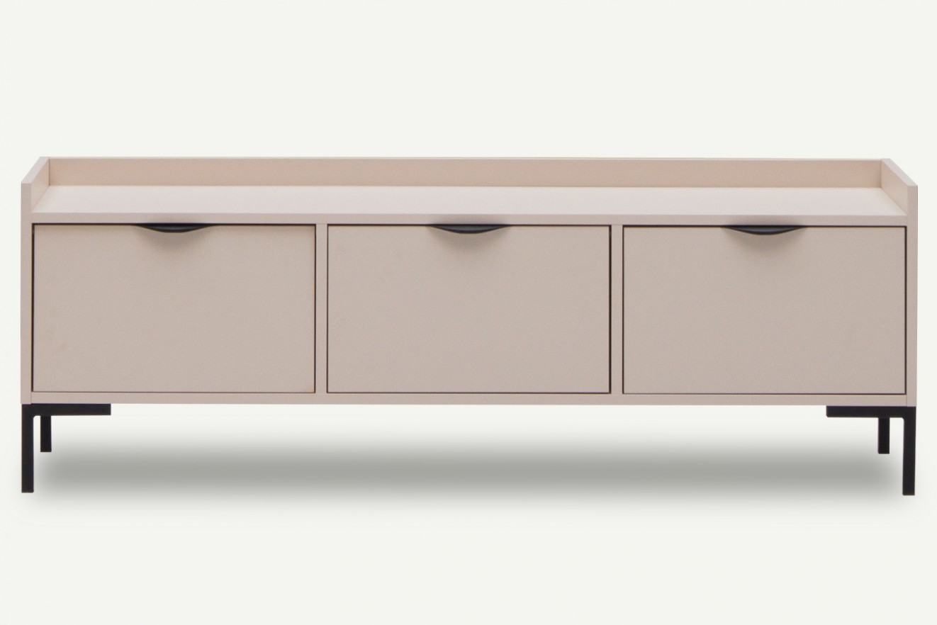 Szafka RTV Klara wyposażona jest w trzy przestronne półki ukryte za uchylnymi frontami. To praktyczne rozwiązanie umożliwia przechowywanie urządzeń multimedialnych, akcesoriów lub innych niezbędnych przedmiotów, zapewniając jednocześnie porządek i estetykę w pomieszczeniu. Wyprofilowane uchwyty nadają meblowi nowoczesny charakter, a solidne metalowe nogi w czarnym kolorze gwarantują stabilność i trwałość.